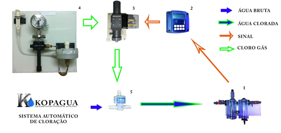 O sistema de automação para linha de cloro consiste na análise da água de uma linha pré-determinada (tanque de armazenagem de água tratada) através de um sensor eletrolítico que envia o resultado desta avaliação para o analisador, (é importante que o sensor não fique localizado em uma distância muito curta do ponto de aplicação, o cloro demora alguns segundos até misturar completamente com a água. Após passar pelo sensor essa água não deve ser enviada de volta para o tanque de armazenagem.) O Analisador compara este resultado a uma dosagem solicitada, que, sendo diferente envia um sinal de 4 a 20 mA para uma válvula de controle de dosagem localizada junto ao aparelho clorador, definindo assim o aumento ou redução na dosagem. Esta dosagem é feita através do ejetor, que é um componente do clorador que mistura o cloro de forma proporcional à água.